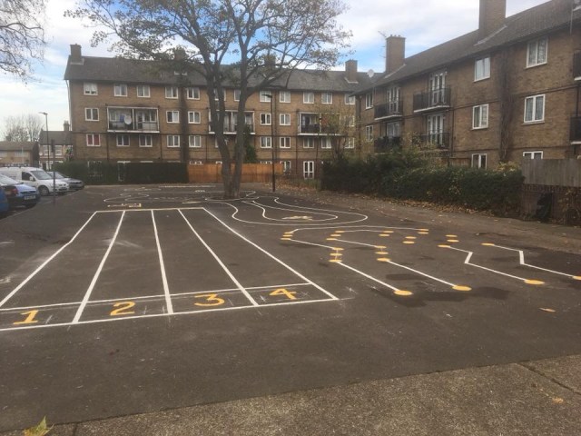 I have just blogged along with Seyi with a full update on this project, so you can read all about it there. Seyi developed and took the lead in Thorogood Gardens, but I’ve had so much pleasure in supporting her, working to make things happen and contribute to her idea of adding lots of little things to make a big difference in one place. I am especially proud to see the play markings go in today – an idea which genuinely just occurred to me as we were visiting one day, as a way of making the most of an unloved bit of tarmac. With some support from Hochtief, this has now been transformed into an area that encourages children to come out and play.