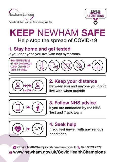 To become a health champion, email covidhealthchampions@newham.gov.uk or call 020 3373 2777. We would like to recruit people from right across the community, who can share information with their friends, their family, their workplace, their local whatsapp group, their neighbours, their reading group, their quiz buddies, their knitting circle… anyone at all. You will be invited to regular briefings, get the most up to date information about the virus, and be given simple information to share. And you can feed back about what you’re hearing ‘on the ground’.