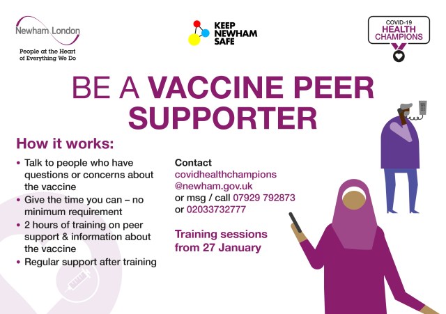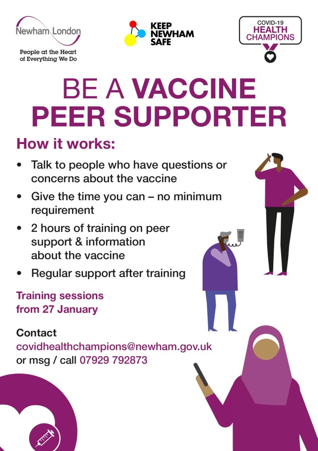 Now that vaccines are being rolled out, the other important part of beating the virus will be ensuring that as many people as possible are vaccinated. If you’d like to help support getting good, reliable information out to your friends, colleagues and contacts, and to people in Newham, then please sign up to be a vaccine peer supporter.