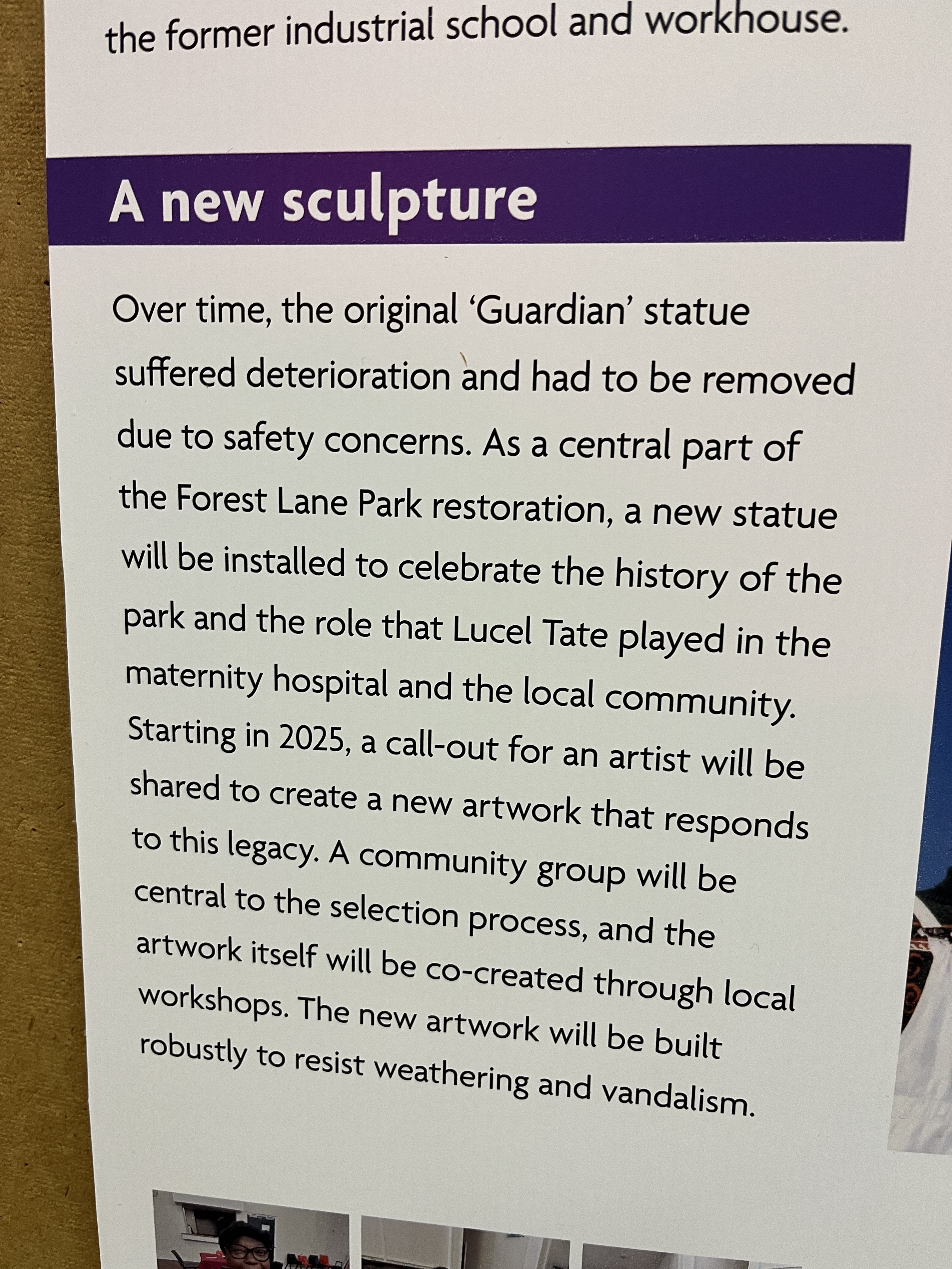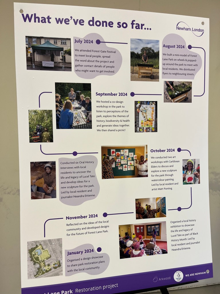 As set out in a previous post, Newham Council has been awarded National Lottery Heritage Funding to improve the park, and in particular to reinstate a statue in memory of Lucel Tate. Currently we are working with an organisation called Arkwood to run community engagement, to develop plans, and this will lead on to the next stage of applying for the funding to make the improvements.
