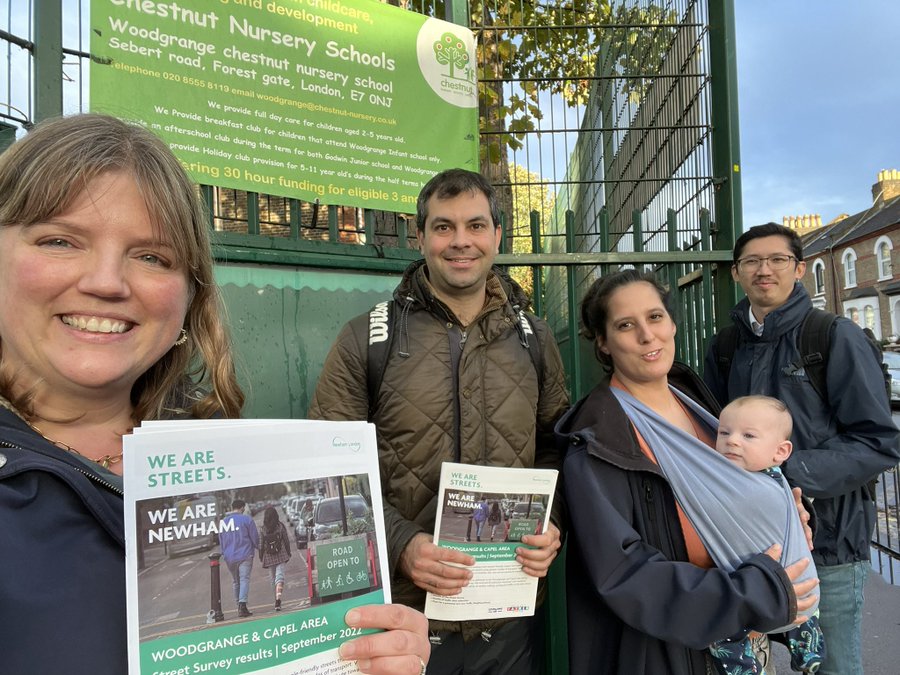 Here she is leafletting and chatting to parents and children about the proposed new LTNs (more info below) with me and a couple of officers outside Woodgrange Infants School.